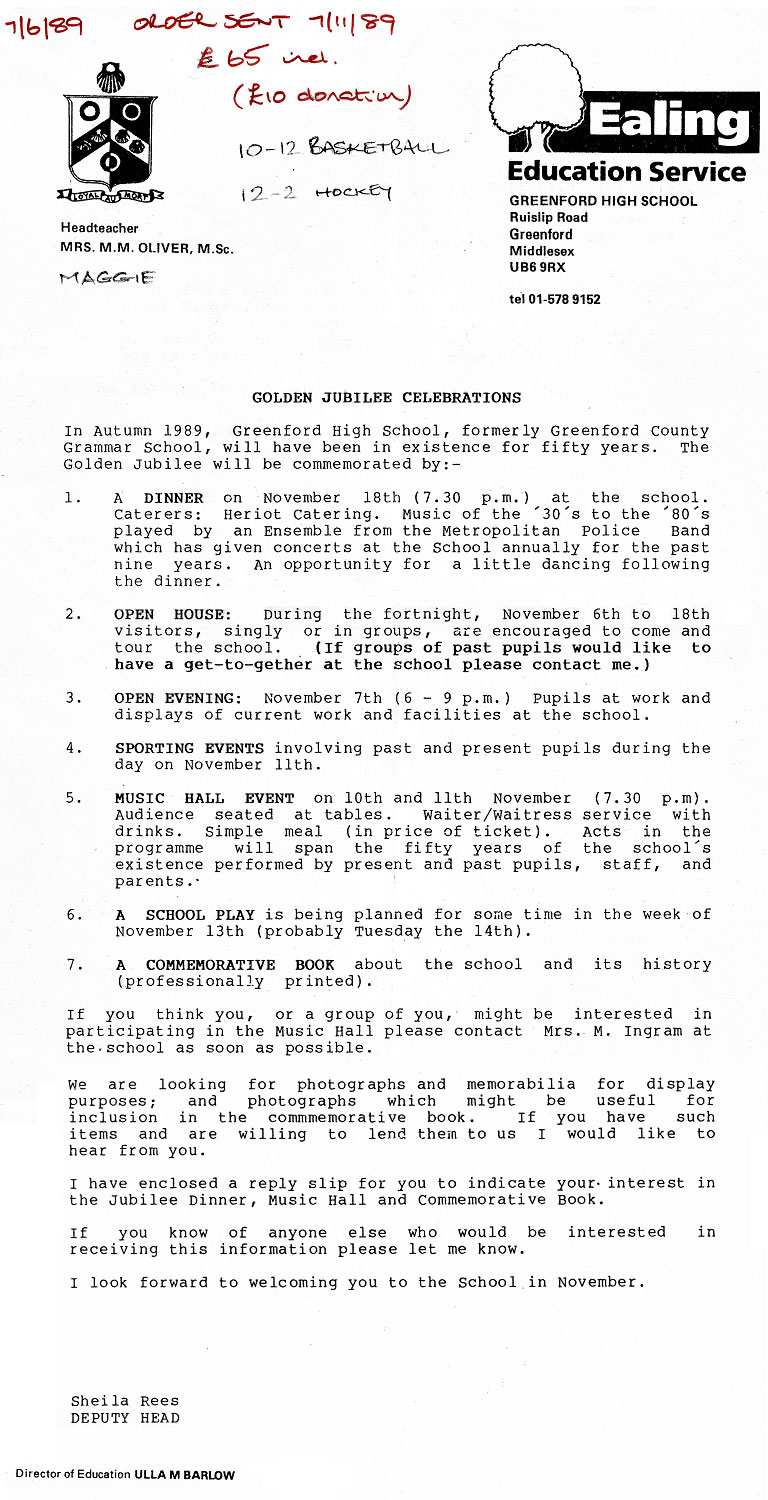 In Autumn 1989, Greenford High School, formerly Greenford County Grammar School, will have been in existence for fifty years.