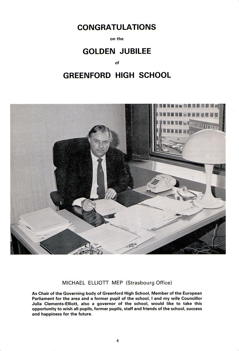 As Chair of the Governing body of Greenford High School, Member of the European Parliament for the area and a former pupil of the school, I and my wife Councillor Julia Clements-Elliott, also a governor of the school, would like to take this opportunity to wish all pupils, former pupils, staff and friends of the school, success and happiness for the future.