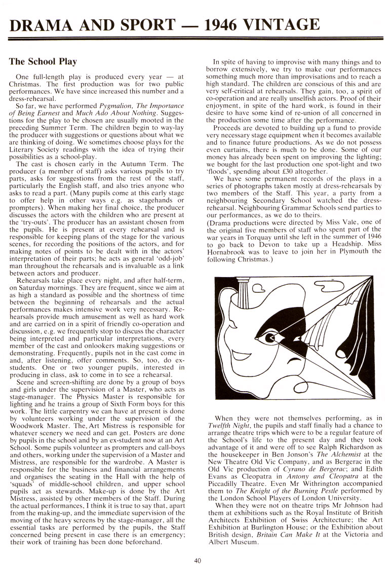 When they were not themselves performing, as in Twelfth Night, the pupils and staff finally had a chance to arrange theatre trips which were to be a regular feature of the School's life to the present day and they took advantage of it and were off to see Ralph Richardson as the housekeeper in Ben Jonson's The Alchemist at the New Theatre Old Vic Company, and as Bergerac in the Old Vic production of Cyrano de Bergerac; and Edith Evans as Cleopatra in Antony and Cleopatra at the Piccadilly Theatre. Even Mr Withrington accompanied them to The Knight of the Burning Pestle performed by the London School Players of London University.