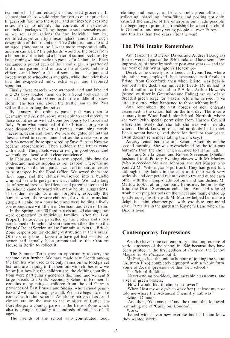 The friends of the school who contributed food, clothing and money, and the school's great efforts at collecting, parcelling, form-filling and posting not only ensured the success of the enterprise but made possible the beginning of promising friendships between the school in Greenford and many young people all over Europe and this less than two years after the war!