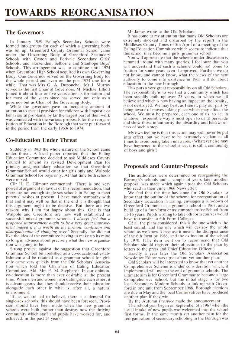 We feel that the time has come for Old Scholars to know that the outline of the scheme for reorganisation of Secondary Education in Ealing, envisages a run-down of Greenford Grammar as a grammar school in 1967, and a build up of a four-form entry comprehensive School from 11-16 years. Pupils wishing to take 6th form courses would have to transfer to 6th Form Colleges.