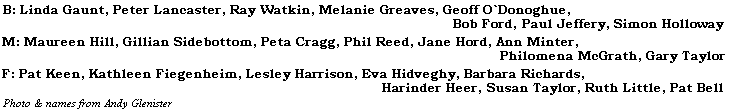 Pat Bell, Peta Cragg, Kathleen Fiegenheim, Bob Ford, Linda Gaunt, Melanie Greaves, Lesley Harrison, Harinder Heer, Eva Hidveghy, Maureen Hill, Simon Holloway, Jane Hord, Paul Jeffery, Pat Keen, Peter Lancaster, Ruth Little, Philomena McGrath, Ann Minter, Geoff O`Donoghue, Phil Reed, Barbara Richards, Gillian Sidebottom, Gary Taylor, Susan Taylor, Ray Watkin