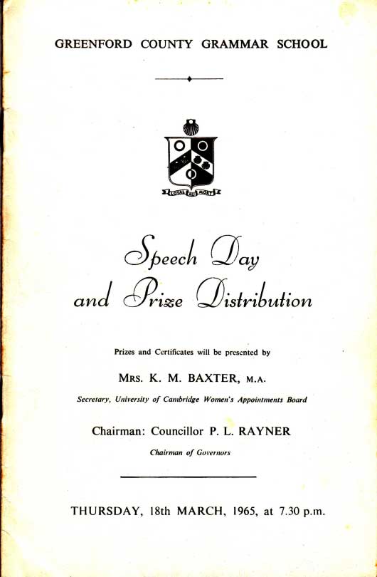 GREENFORD COUNTY GRAMMAR SCHOOL MRS. K. M. BAXTER, M.A. Secretary, University of Cambridge Women's Appointments Board Chairman: Councillor P. L. RAYNER Chairman of Governors THURSDAY, 18th MARCH, 1965, at 7.30 p.m.