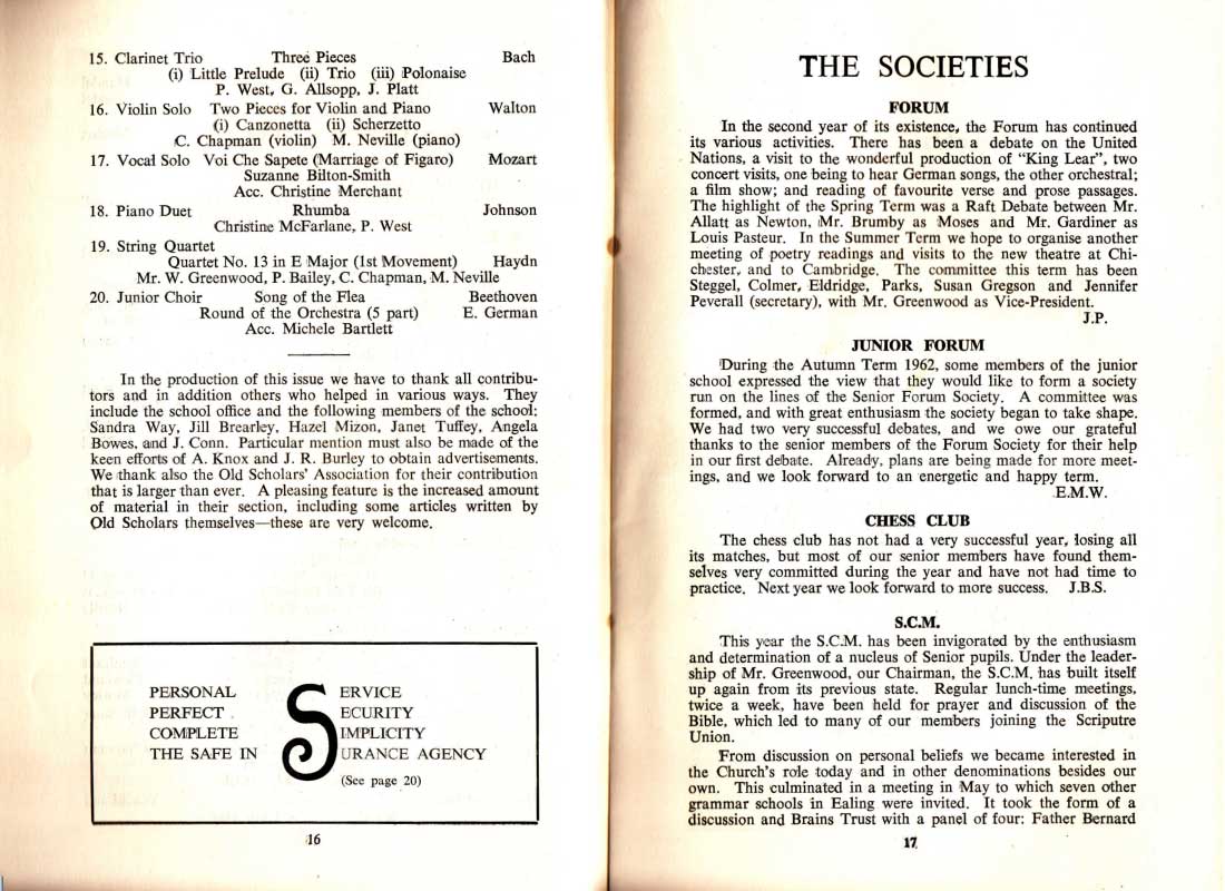 During the Autumn Term 1962, some members of the junior school expressed the view that they would like to form a society run on the lines of the Senior Forum Society. A committee was formed, and with great enthusiasm the society began to take shape. We had two very successful debates, and we owe our grateful thanks to the senior members of the Forum Society for their help in our first debate. Already, plans are being made for more meetings, and we look forward to an energetic and happy term.