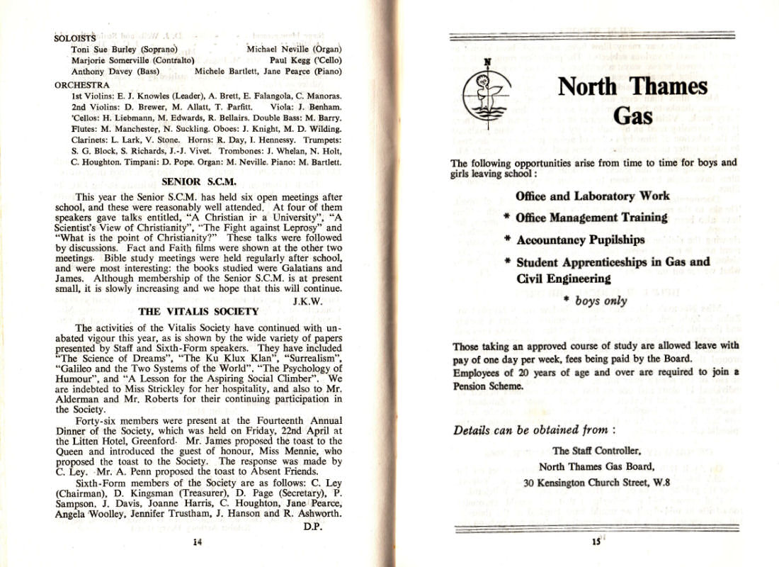 Sixth-Form members of the Society are as follows: C. Ley (Chairman), D. Kingsman (Treasurer), D. Page (Secretary), P. Sampson, J. Davis, Joanne Harris, C. Houghton, Jane Pearce, Angela Woolley, Jennifer Trustham, J. Hanson and R. Ashworth.