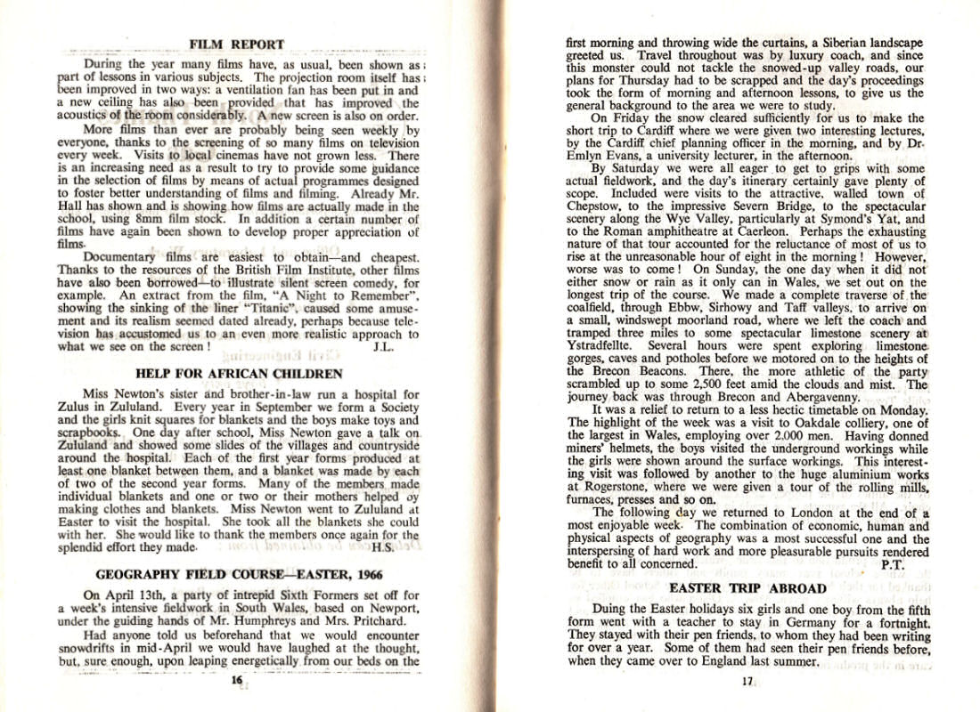 Miss Newton's sister and brother-in-law run a hospital for Zulus in Zululand. Every year in September we form a Society and the girls knit squares for blankets and the boys make toys and scrapbooks. One day after school, Miss Newton gave a talk on Zululand and showed some slides of the villages and countryside around the hospital. Each of the first year forms produced at least one blanket between them, and a blanket was made by each of two of the second year forms. Many of the members made individual blankets and one or two or their mothers helped oy making clothes and blankets. Miss Newton went to Zululand at Easter to visit the hospital. She took all the blankets she could with her. She would like to thank the members once again for the splendid effort they made- H.S.