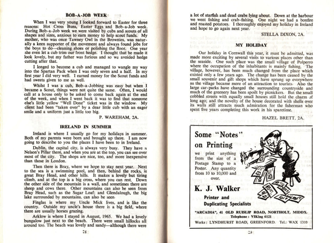 Our holiday in Cornwall this year, it must be admitted, was made more exciting by several visits to various places other than the seaside. One such place was the small village of Polperro where the occupation of the inhabitants is mainly fishing. The village, however, has been much changed from the place which existed only a few years ago. The change has been caused by the small souvenir and gift shops which have sprung up everywhere as the village became more of an attraction to tourists- Also the large car-parks have changed the surrounding countryside and much of the greenery has been spoilt by picnickers. But the small cobbled streets with equally small houses still hold the charm of long ago; and the novelty of the house decorated with shells over its walls still attracts much admiration for the fisherman who spent five years completing this work in his sparetime.