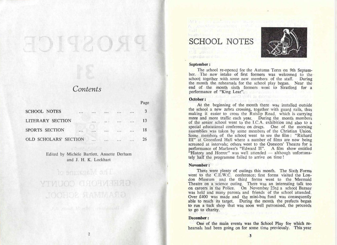 One of the morning assemblies was taken by some members of the Christian Union Some members of the school went to see the film : Richard III at Greenford Hall where a number of films are now being screened at intervals; others went to the Questors' Theatre for a performance of Marlowe's Edward II. A film show entitled History and Horror was well attended — although unfortunately half the programme failed to arrive on time!