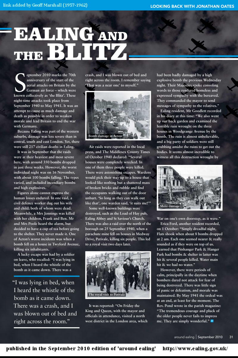 Erica Ford, another resident recorded, on 1 October: "Simply dreadful night, Flats shook when about 8 bombs dropped at 2 am. Each one seemed nearer & really sounded as if they were on top of us. Learned that Pitshanger Park & Hanger Park had bombs & shelter in latter was hit & several people killed. Water main hit & we had no water."