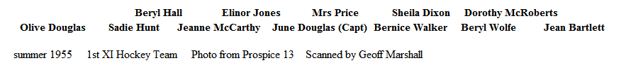 Beryl Hall, Elinor Jones, Sheila Dixon, Mrs Price, Dorothy McRoberts, Olive Douglas, Sadie Hunt, Jeanne McCarthy, June Douglas (Capt), Bernice Walker, Beryl Wolfe, Jean Bartlett