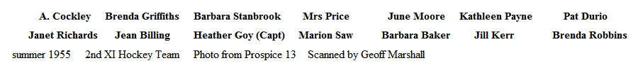 A. Cockley, Brenda Griffiths, Barbara Stanbrook, Mrs Price, June Moore, Kathleen Payne, Pat Durio, Janet Richards, Jean Billing, Heather Goy (Capt), Marion Saw, Barbara Baker, Jill Kerr, Brenda Robbins