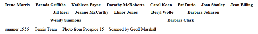Irene Morris, Brenda Griffiths, Kathleen Payne, Dorothy McRoberts, Carol Keen, Pat Durio, Joan Stanley, Jean Billing, Jill Kerr, Jeanne McCarthy, Elinor Jones, Beryl Wolfe, Barbara Johnson, Wendy Simmons, Barbara Clark