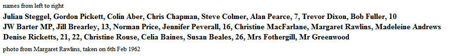 Alan Pearce, Bob Fuller, Celia Baines, Chris Chapman, Christine MacFarlane, Christine Rouse, Colin Aber, Denise Ricketts, Gordon Pickett, J.W. Barter, Jennifer Peverall, Jill Brearley, Julian Steggel, Madeline Andrews, Margaret Rawlins, Mr Greenwood, Mrs Fothergill, Norman Price, Steve Colmer, Susan Beales, Trevor Dixon