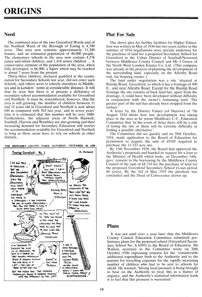 The above plea for further facilities for Higher Education was written in May of 1936 but two years earlier in the summer of 1934 negotiations were already underway for the purchase of land for a proposed Secondary School for Greenford in the Urban District of Southall/Norwood between Middlesex County Council and Mr J Green of the North West London Estates Co. Ltd.