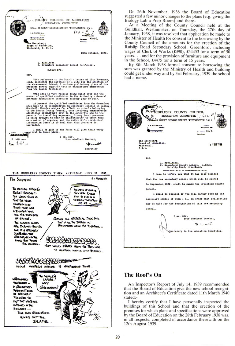 On 26th November, 1936 the Board of Education suggested a few minor changes to the plans (e.g. giving the Biology Lab a Prep Room) and then:-