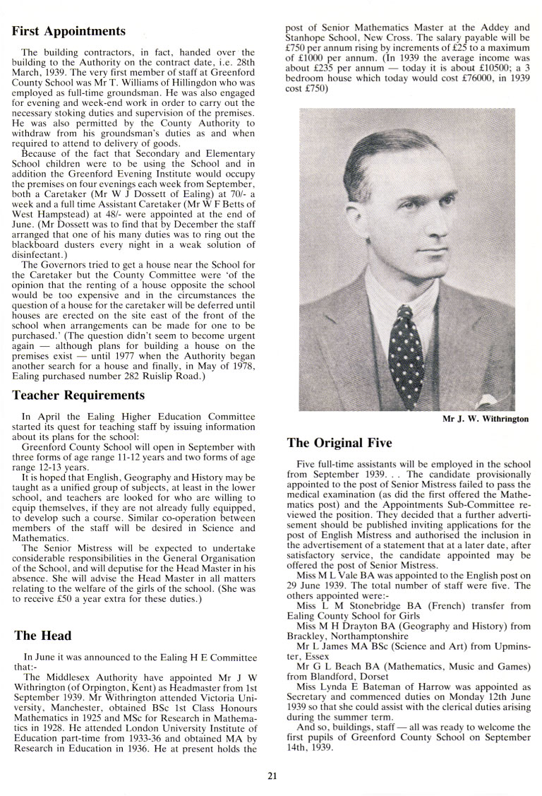 The Middlesex Authority have appointed Mr J W Withrington (of Orpington, Kent) as Headmaster from 1st September 1939.