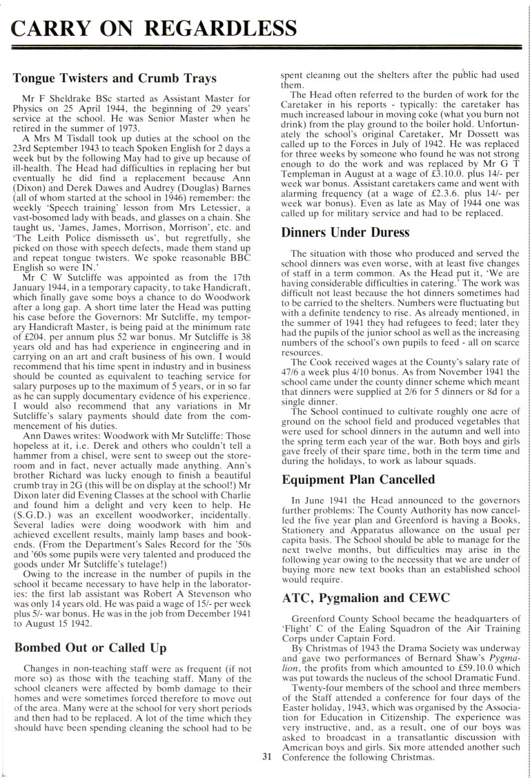 By Christmas of 1943 the Drama Society was underway and gave two performances of Bernard Shaw's Pygmalion, the profits from which amounted to f59.10.0 which was put towards the nucleus of the school Dramatic Fund.