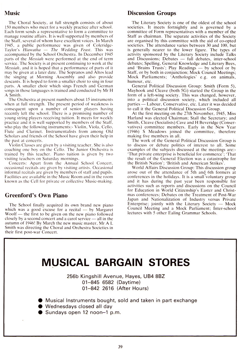 The School finally acquired its own brand new piano which was a good excuse for a recital by Margaret Woolf the first to be given on the new piano followed closely by a second concert and a carol service all in the autumn of 1946!