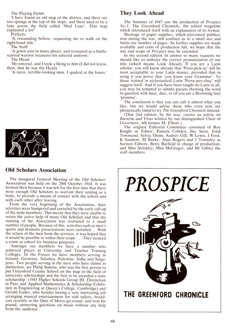 The Summer of 1947 saw the production of Prospice No.1, The Greenford Chronicle, the school magazine which introduced itself with an explanation of its format: Shortage of paper supplies, which prevented publication during the war, still confines us to a small size and limits our number of pages. As further supplies are made available and costs of production fall, we hope that the size and scope of Prospice may be extended.