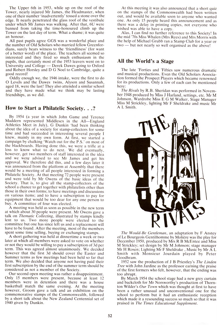 By 1954 (a year in which John Game and Terence Maddern represented Middlesex in the AllEngland Athletics Meet in July), G Dunkin had been thinking about the idea of a society for stamp-collectors for some time and had succeeded in interesting several people I knew, mainly in my own form. At first, we started a campaign by chalking 'Watch out for the P.S.' on most of the blackboards. Having done this, we were a trifle at a loss to know what to do next. We did eventually, however, get two members of staff interested in the idea and we were advised to see Mr James and get his approval. We therefore did this, and a few days later it was announced from the platform at Assembly that there would be a meeting of all people interested in forming a Philatelic Society. At that meeting 72 people were present and were told by Mr Owens of the basic ideas of the Society. That is, to give all the stamp-collectors of the school a chance to get together with philatelists other than those in their own form, to have meetings and discussions on various items; and to have a subscription to pay for equipment that would be too dear for any one person to buy. A committee of four was elected.