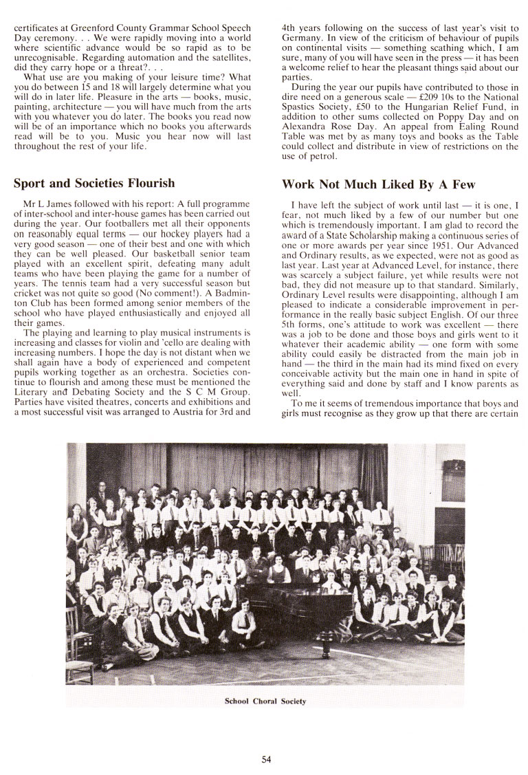 The playing and learning to play musical instruments is increasing and classes for violin and 'cello are dealing with increasing numbers. I hope the day is not distant when we shall again have a body of experienced and competent pupils working together as an orchestra. Societies continue to flourish and among these must be mentioned the Literary and Debating Society and the S C M Group. Parties have visited theatres, concerts and exhibitions and a most successful visit was arranged to Austria for 3rd and 4th years following on the success of last year's visit to Germany. In view of the criticism of behaviour of pupils on continental visits something scathing which, I am sure, many of you will have seen in the press it has been a welcome relief to hear the pleasant things said about our parties.