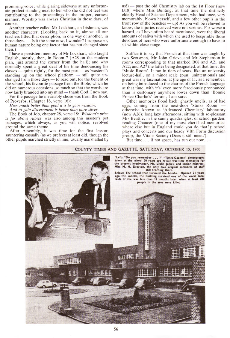 Other memories flood back: ghastly smells, as of bad eggs, coming from the next-door 'Stinks Room' otherwise known as 'Advanced Chemistry' laboratory (now A26); long lazy afternoons, sitting with so-pleasant Mrs Beattie, in the sunny quadrangles, or school garden, reading Chaucer (one of my most cherished memories: where else but in England could you do that?); school plays and concerts and our heady VIth Form discussion group, the Vitalis Society (Does it still meet?).