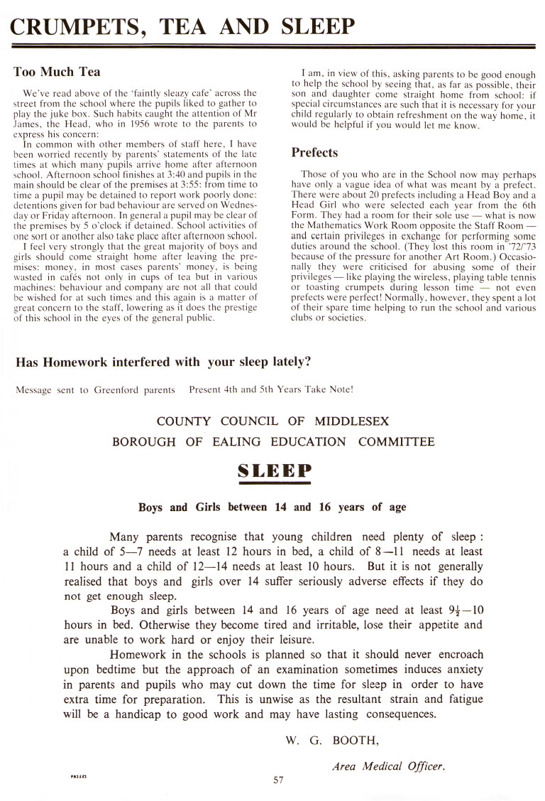 Those of you who are in the School now may perhaps have only a vague idea of what was meant by a prefect. There were about 20 prefects including a Head Boy and a Head Girl who were selected each year from the 6th Form. They had a room for their sole use what is now the Mathematics Work Room opposite the Staff Room and certain privileges in exchange for performing some duties around the school. (They lost this room in '72/73 because of the pressure for another Art Room.) Occasionally they were criticised for abusing some of their privileges like playing the wireless, playing table tennis or toasting crumpets during lesson time not even prefects were perfect! Normally, however, they spent a lot of their spare time helping to run the school and various clubs or societies.