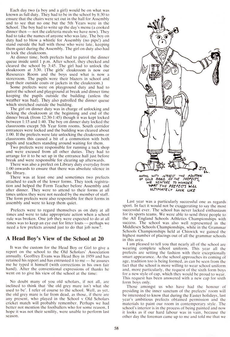 It was the custom for the Head Boy or Girl to give a report on the school to the Old Scholars' Association annually, Geoffrey Evans was Head Boy in 1959 and has retained his report and has entrusted it to me he assures me he typed it himself (with corrections in his own fair hand). After the conventional expressions of thanks he went on to give his view of the school at the time: