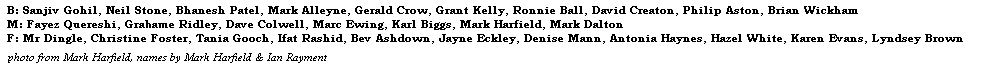Bhanesh Patel, Brian Wickham, Dave Colwell, David Creaton, Fayez Quereshi, Gerald Crow, Grahame Ridley, Grant Kelly, Karl Biggs, Marc Ewing, Mark Alleyne, Mark Dalton, Mark Harfield, Neil Stone, Philip Aston, Ronnie Ball, Sanjiv Gohil