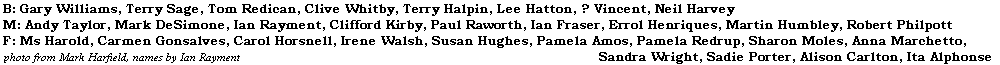 ? Vincent, Alison Carlton, Andy Taylor, Anna Marchetto, Carmen Gonsalves, Carol Horsnell, Clifford Kirby, Clive Whitby, Errol Henriques, Gary Williams, Ian Fraser, Ian Rayment, Irene Walsh, Ita Alphonse, Lee Hatton, Mark DeSimone, Martin Humbley, Ms Harold, Neil Harvey, Pamela Amos, Pamela Redrup, Paul Raworth, Robert Philpott, Sadie Porter, Sandra Wright, Sharon Moles, Susan Hughes, Terry Halpin, Terry Sage, Tom Redican