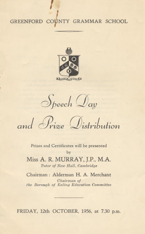 GREENFORD COUNTY GRAMMAR SCHOOL Prizes and Certificates will be presented by Miss A. R. MURRAY, J.P., M.A. Tutor of New Hall, Cambridge Chairman: Alderman H. A. Merchant Chairman of the Borough of Ealing Education Committee FRIDAY, 12th OCTOBER, 1956, at 7.30 p.m.