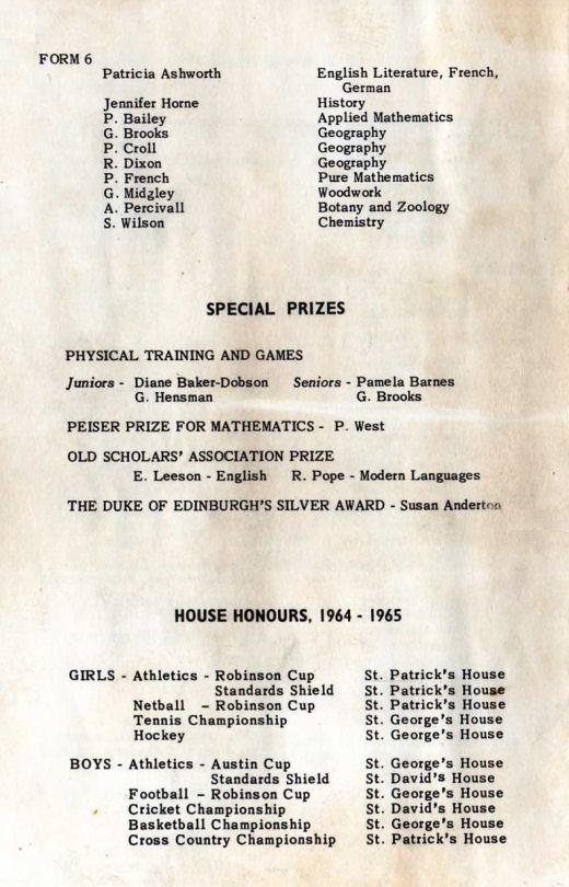 HOUSE HONOURS, 1964 - 1965