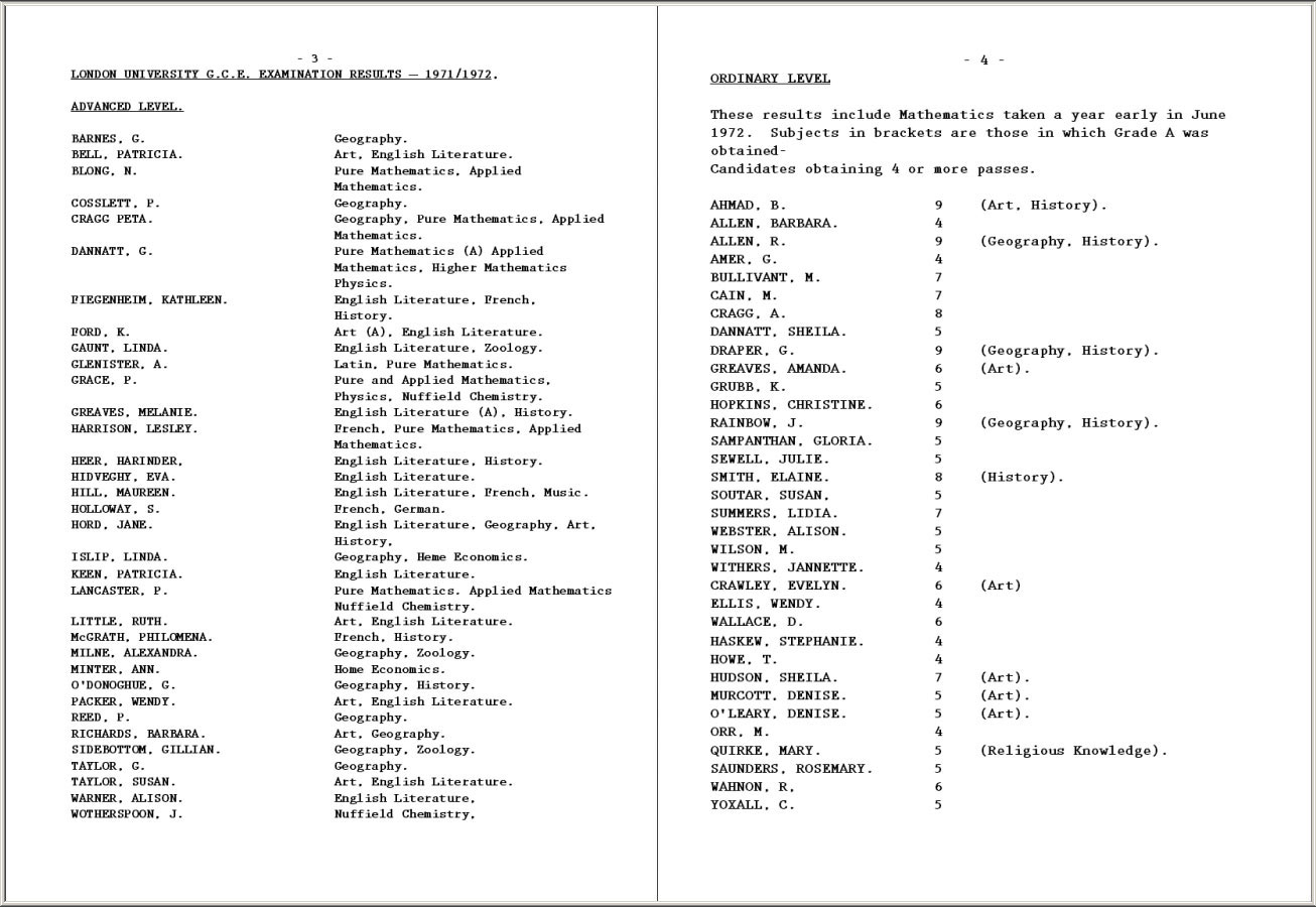 LONDON UNIVERSITY G.C.E EXAMINATION RESULTS - 1971/1972.