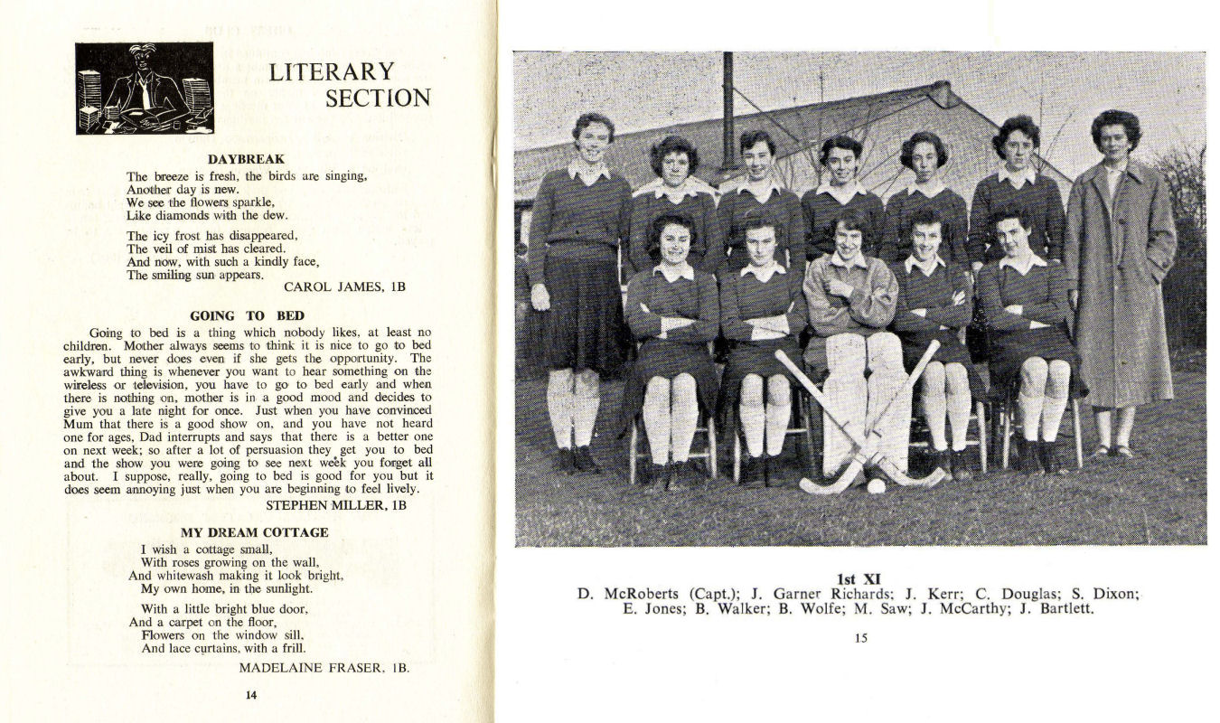 1st XI, Dorothy McRoberts, Janet Garner-Richards, Jill Kerr, Olive Douglas, Sheila Dixon, Elinor Jones, Mrs Price, Bernice Walker, Beryl Wolfe, Marion Saw, Jeanne McCarthy, Jean Bartlett