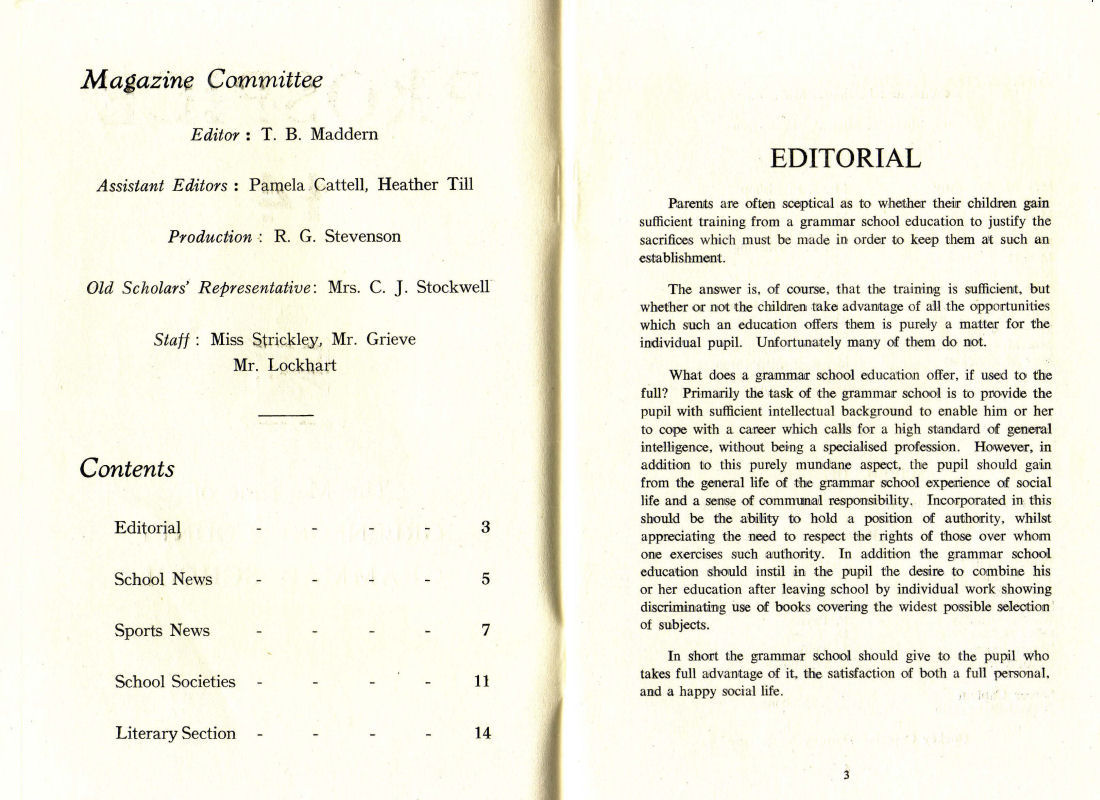 Magazine Committee Editor : T. B. Maddern Assistant Editors : Pamela Cattell, Heather Till Production : R. G. Stevenson Old Scholars' Representative : Mrs. C. J. Stockwell Staff : Miss Strickley, Mr. Grieve, Mr. Lockhart p3