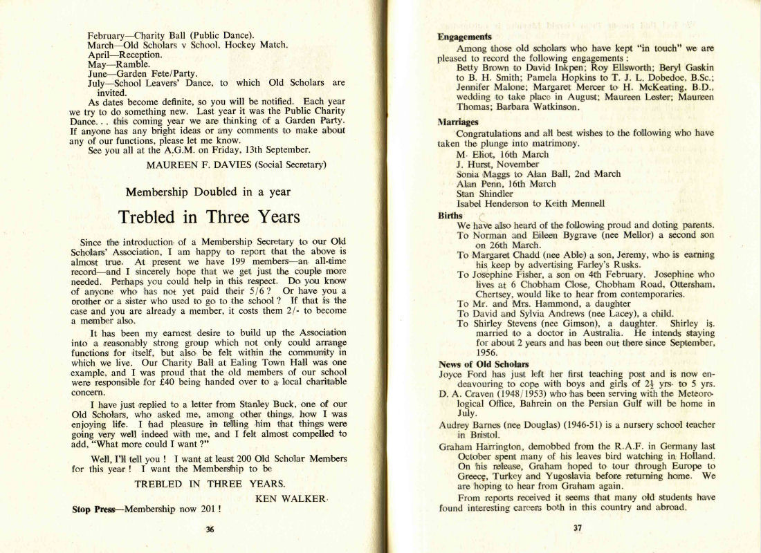 Betty Brown to David Inkpen; Roy Ellsworth; Beryl Gaskin to B. H. Smith; Pamela Hopkins to T. J. L. Dobedoe, B.Sc; Jennifer Malone; Margaret Mercer to H. McKeating, B.D., wedding to take place in August; Maureen Lester; Maureen Thomas; Barbara Watkinson