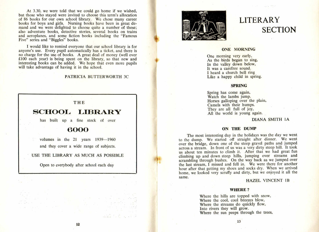 PATRICIA BUTTERWORTH 3C THE SCHOOL LIBRARY LITERARY SECTION DIANA SMITH 1A HAZEL VINCENT IB p13