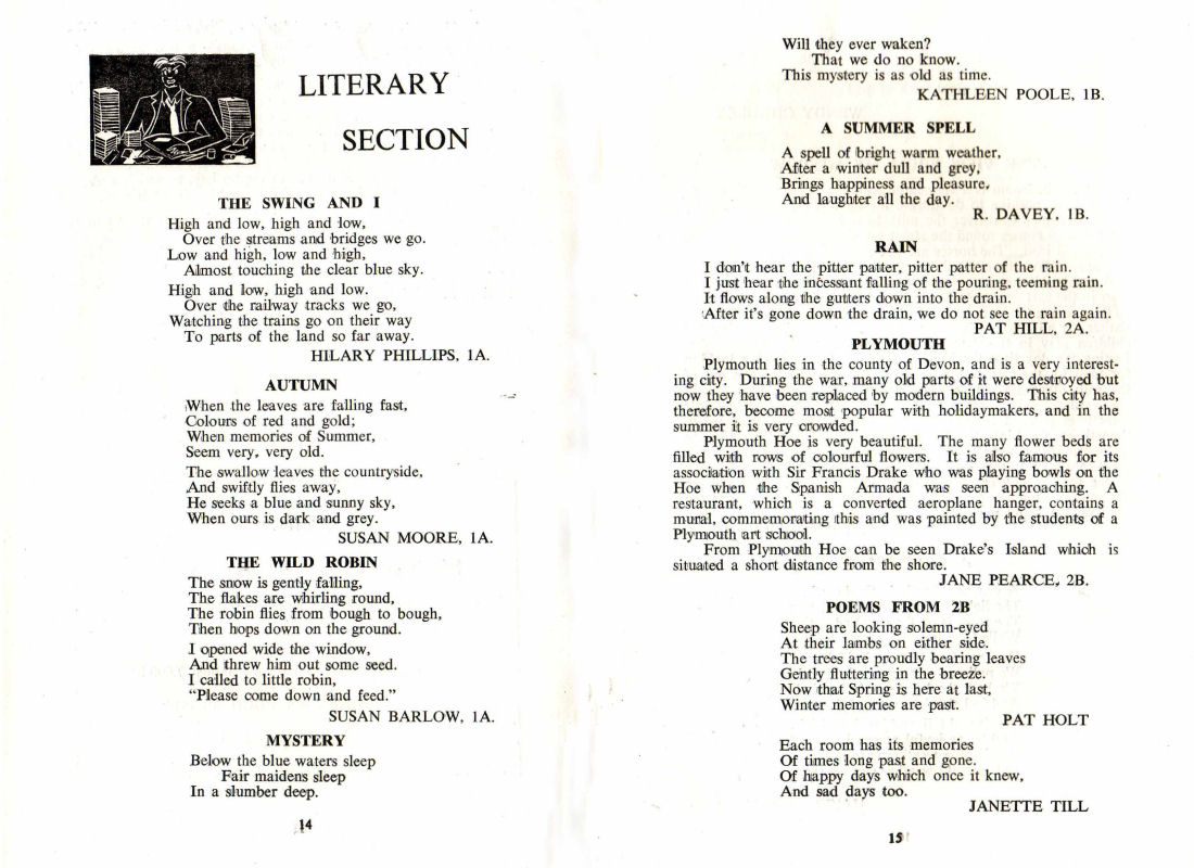 p14/15 LITERARY SECTION HILARY PHILLIPS, 1A SUSAN MOORE, 1A SUSAN BARLOW, 1A p14 KATHLEEN POOLE, IB R. DAVEY. IB PAT HILL, 2A JANE PEARCE, 2B PAT HOLT And sad days too JANETTE TILL p15