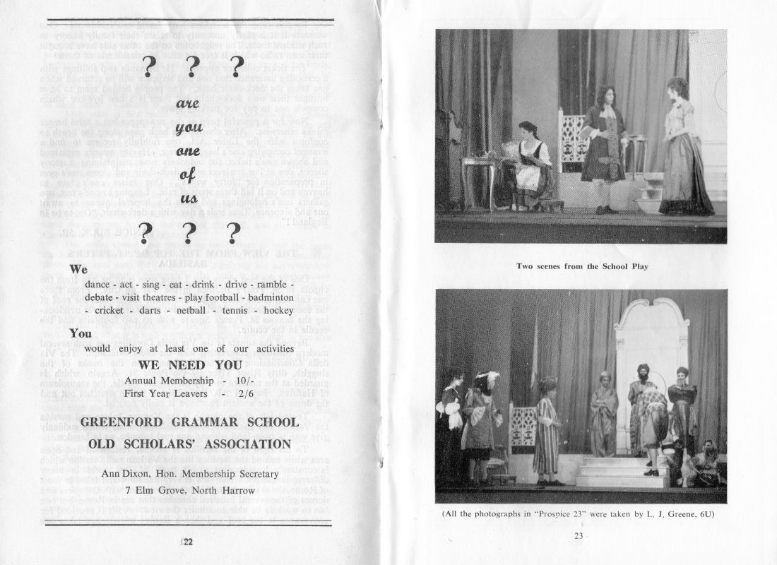 p22/23 GREENFORD GRAMMAR SCHOOL OLD SCHOLARS' ASSOCIATION Ann Dixon, Hon. Membership Secretary 7 Elm Grove, North Harrow p22 Two scenes from the School Play All the photographs in "Prospice 23" were taken by L. J. Greene, 6U p23