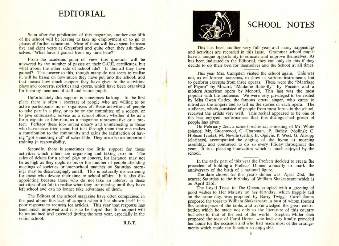 school orchestra, Mr. White (piano); Mr. Greenwood, C. Chapman, P. Bailey (violins); C. Hobson (viola); M. Neville (cello); B. Ogilvie, P. West, G. Allsopp (clarinets)