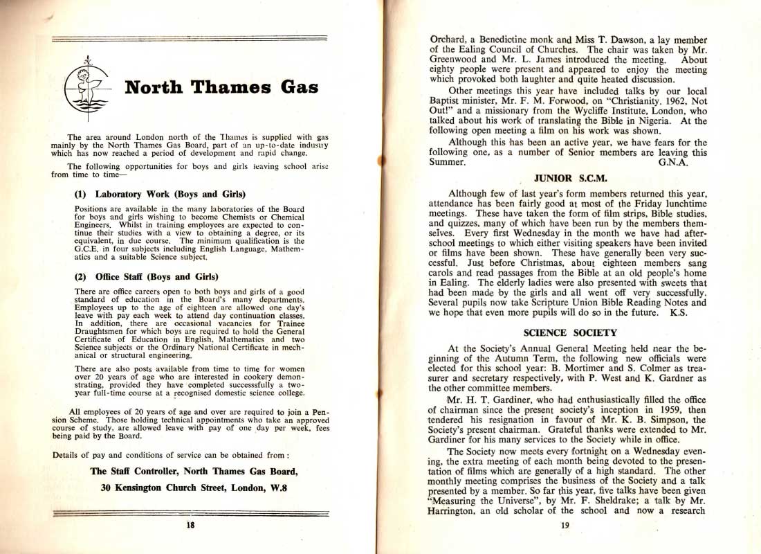 Although few of last year's form members returned this year, attendance has been fairly good at most of the Friday lunchtime meetings. These have taken the form of film strips, Bible studies, and quizzes, many of which have been run by the members themselves. Every first Wednesday in the month we have had after-school meetings to which either visiting speakers have been invited or films have been shown. These have generally been very successful. Just before Christmas, about eighteen members sang carols and read passages from the Bible at an old people's home in Ealing. The elderly ladies were also presented with sweets that had been made by the girls and all went off very successfully. Several pupils now take Scripture Union Bible Reading Notes and we hope that even more pupils will do so in the future. K.S.
