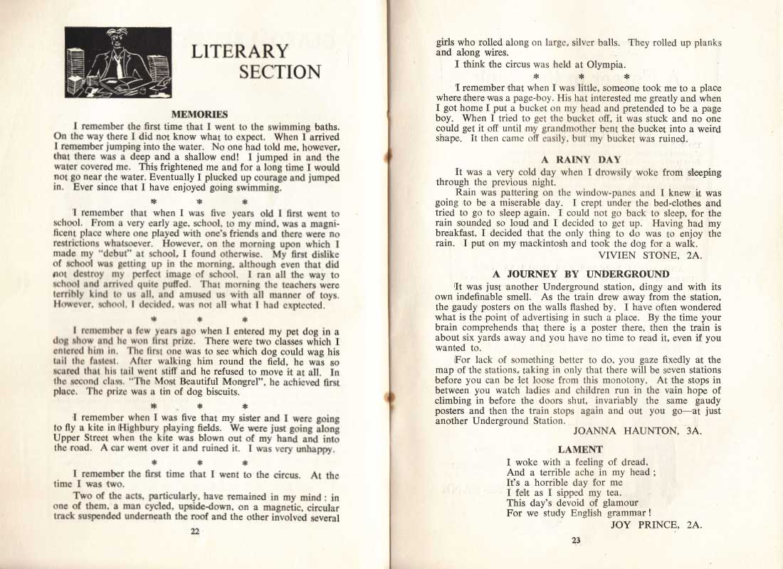 LITERARY SECTION MEMORIES 22 A RAINY DAY VIVIEN STONE, 2A. A JOURNEY BY UNDERGROUND JOANNA HAUNTON, 3A. LAMENT JOY PRINCE, 2A. 23