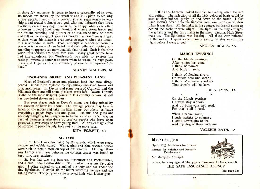 SWITZERLAND ALYSON WALTERS, 6L ENGLAND'S GREEN AND PLEASANT LAND RITA FOSSETT, 4B. ST. IVES 26 ANGELA BOWES, 5A. MARCH EVENINGS VALERIE BATH, 1A. 27