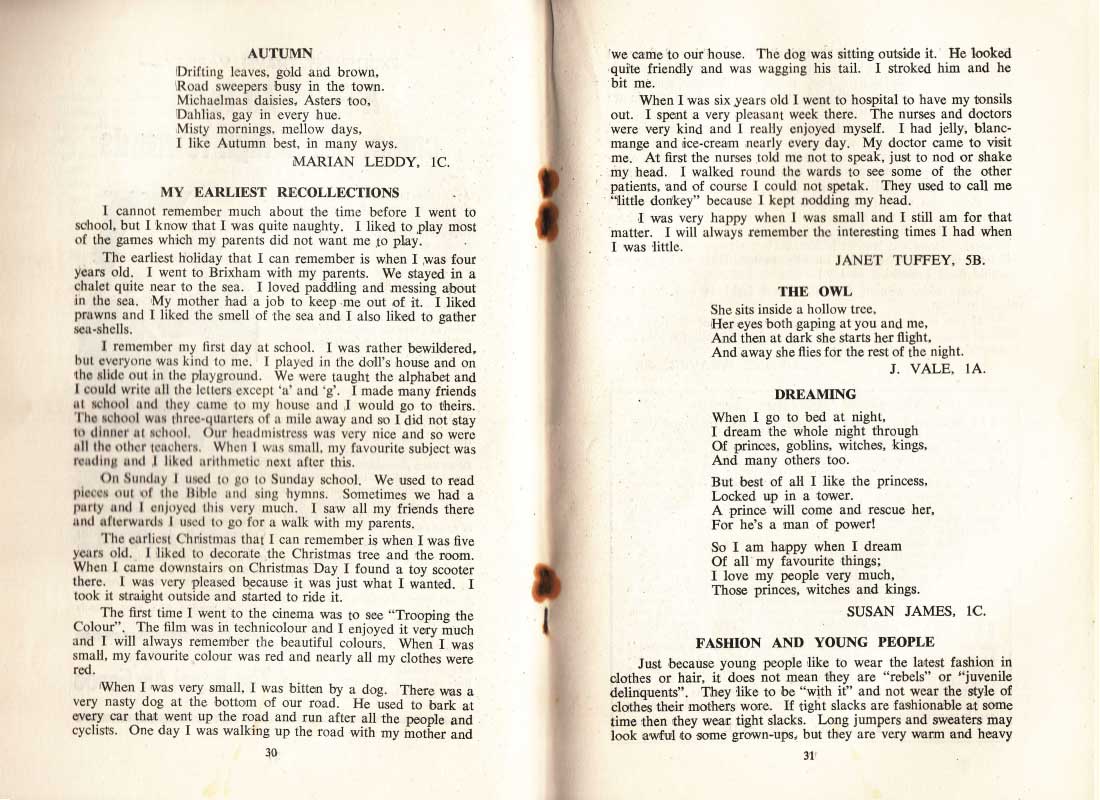 AUTUMN MARIAN LEDDY, 1C. MY EARLIEST RECOLLECTIONS 30 JANET TUFFEY, 5B. THE OWL J. VALE, 1A. DREAMING SUSAN JAMES, 1C. FASHION AND YOUNG PEOPLE 31