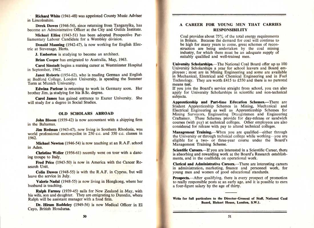 Derek Dawes (1946-54), since returning from Tanganyika, has become an Administrative Officer at the City and Guilds Institute.