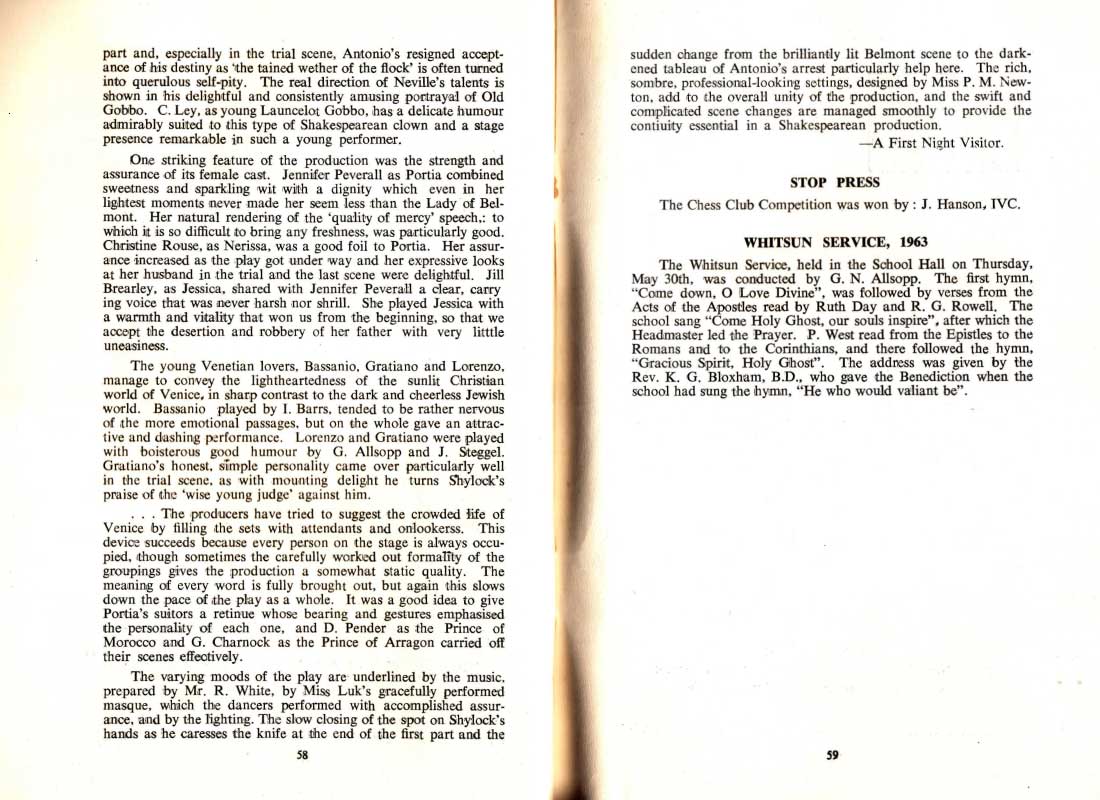 The Whitsun Service, held in the School Hall on Thursday, May 30th, was conducted by G. N. Allsopp. The first hymn, "Come down, O Love Divine", was followed by verses from the Acts of the Apostles read by Ruth Day and R. G. Rowell. The school sang "Come Holy Ghost, our souls inspire", after which the Headmaster led the Prayer. P. West read from the Epistles to the Romans and to the Corinthians, and there followed the hymn, "Gracious Spirit, Holy Ghost". The address was given by the Rev. K. G. Bloxham, B.D., who gave the Benediction when the school had sung the hymn, "He who would valiant be".
