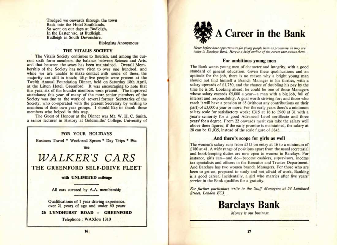 The Vitalis Society continues to flourish, and among the current sixth form members, the balance between Science and Arts, and that between the sexes has been maintained. Overall Membership of the Society has now risen to over one hundred, and while we are unable to make contact with some of these, the majority are still in touch; fifty-five people were present at the Twelth Annual Foundation Dinner, held on Saturday 18th April, at the Litten Hotel, Greenford. It was encouraging to note that this year, six of the founder members were present. The improved attendance this year of many of the more senior members of the Society was due to the work of several former Secretaries of the Society, who co-operated with the present Secretary by writing to members of their own year groups. I should like to thank those members who helped in this way.