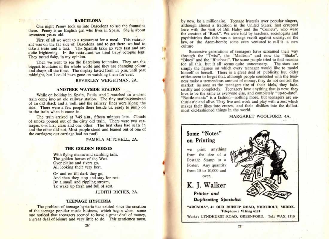 BARCELONA BEVERLEY WEIGHTMAN, 2A. ANOTHER WAYSIDE STATION PAMELA MITCHELL, 2A. THE GOLDEN HORSES JUDITH RICHES, 2A. TEENAGE HYSTERIA 26 MARGARET WOOLFORD, 4A. K. J. Walker Printer and Duplicating Specialist 27
