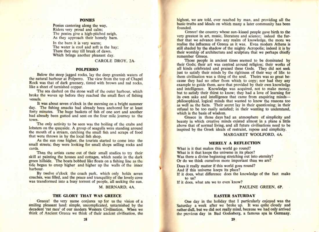 PONIES CAROLE DROY, 2A POLPERRO M. BERNARD, 4A. THE GLORY THAT WAS GREECE 28 MARGARET WOOLFORD, 4A- MERELY A REFLECTION PAULINE GREEN, 6P. EASTER SATURDAY 29