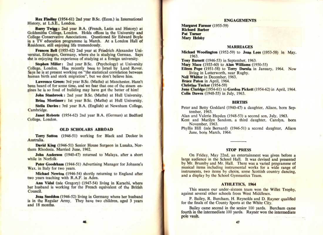 June Claridge (1954-61) to Gordon Pickett (1954-62) in April, 1964. Colin Dawes (1948-55) in July, 1963.